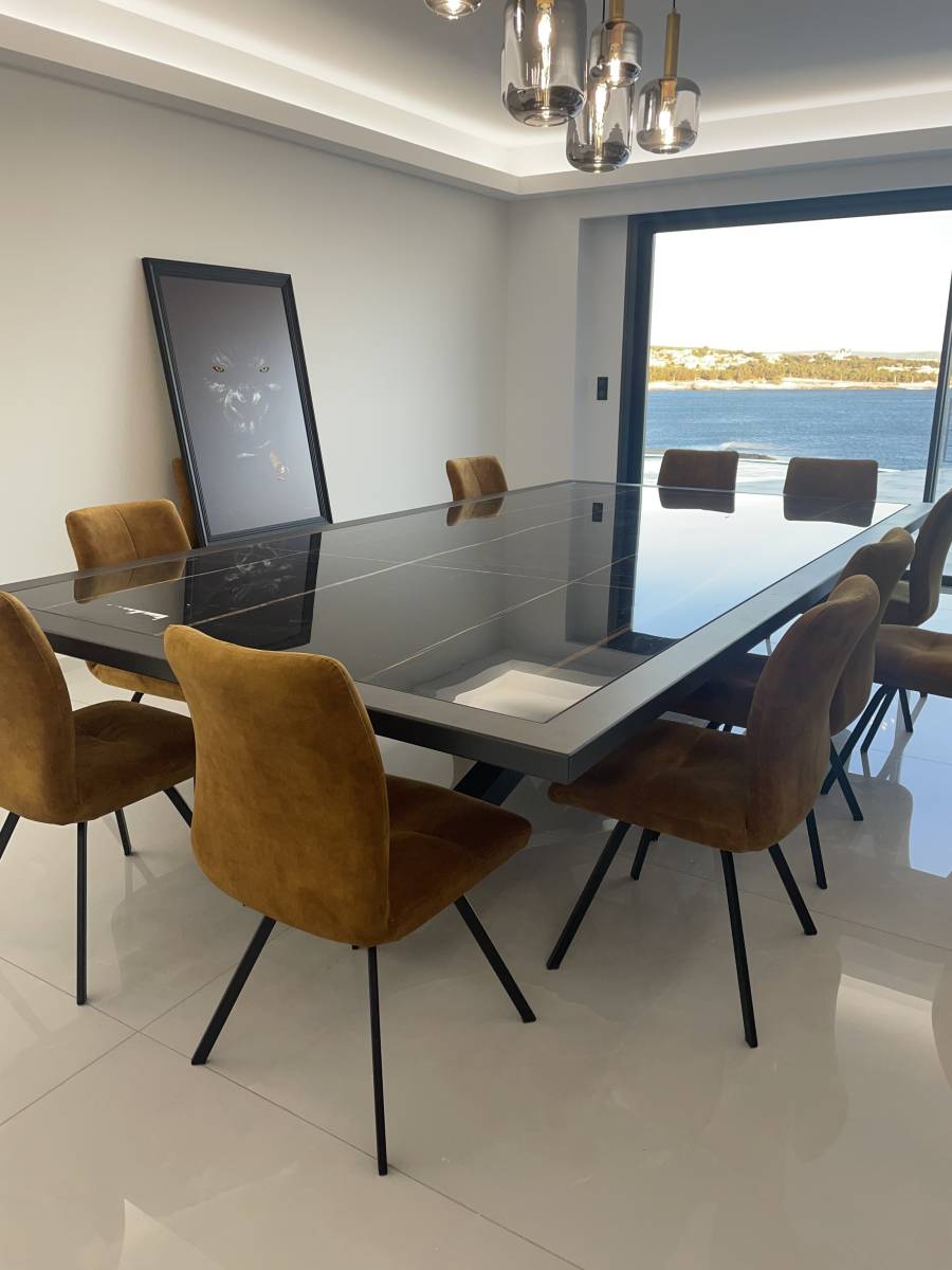 La table de salle à manger, pesant 350 kg, est livrée avec le même soin apporté à sa fabrication. L'installation est effectuée par des professionnels pour garantir la stabilité et la sécurité dans la salle à manger du client.