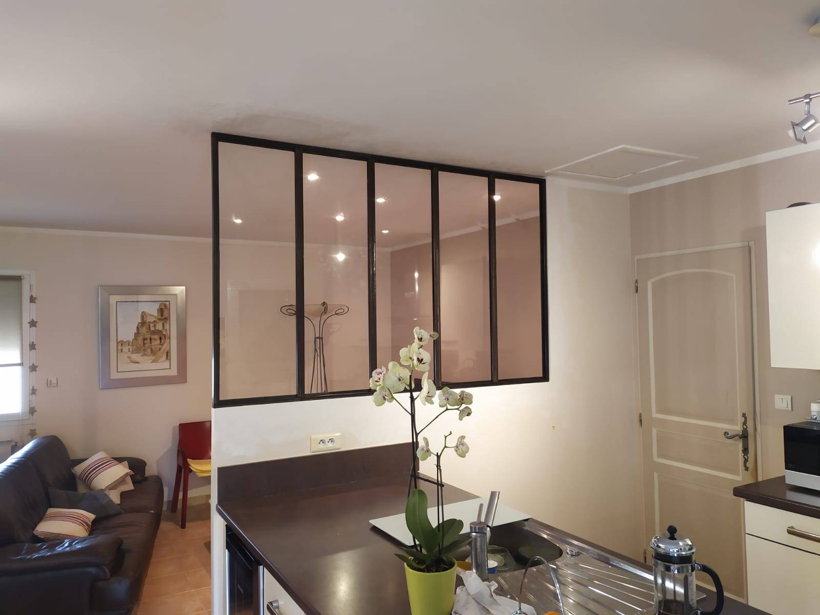 La verrière d'intérieur permet une séparation visuelle entre la cuisine et le séjour sans sacrifier l'espace et la luminosité. La transparence des vitres laisse passer la lumière naturelle, créant une sensation d'espace ouvert tout en délimitant distinctement les deux zones.